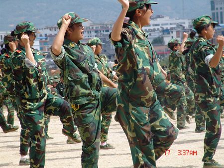 各连以坐姿重新整齐好长方形的队伍,军训汇报表演开始揭开它的神秘面纱。刚劲的“一二一”响起,全场掌声也随之响起,一群男生从方正中跑出,带来了军体拳的分解和连贯表演,整齐的招式、利落的动作构成一副飒爽的宏图,引起了阵阵掌潮。女版的军体拳表演证实了“巾帼不让须眉”的豪迈。队列表演也包括了男女两个版本,该表演首先带来了听觉上的震撼,走步时,鞋底与沙地摩擦发出的沙沙声间隔均匀,无一个拖泥带水的声音传入耳际;视觉上,整齐在这里达到了一种极致美。最后一组表演似一丝清风,把创造力融入庄严中,吹来一股“新”风。该组唱着《军中绿花》出场,几个优美的弧线走队后,呈现出五环的造型,为军训汇演添加了奥运元素。