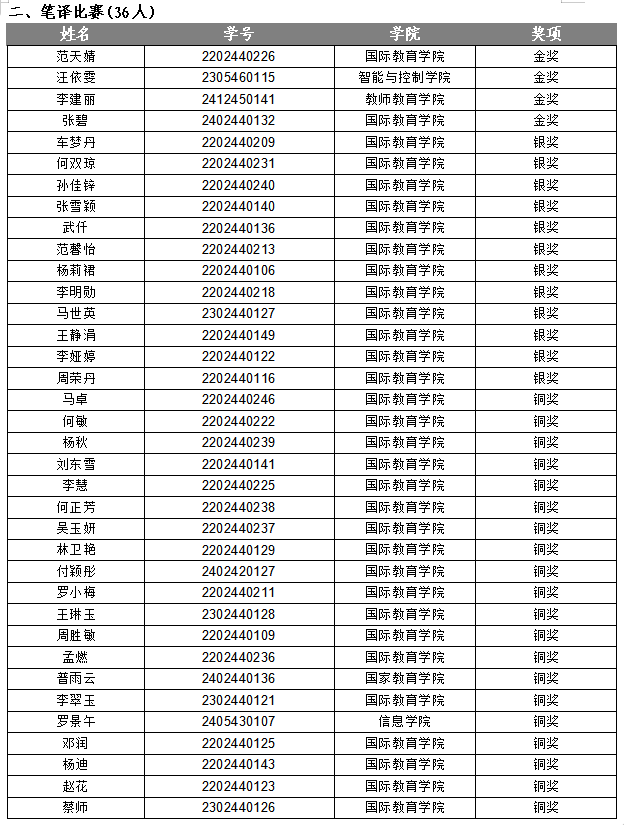 根据云南省教育厅办公室关于举办2024“外研社· 国才杯”“理解当代中国”全国大学生外语能力大赛云南省复赛的通知要求,经学校同意,国际教育学院于2024年9月21日至2024年10月16日成功举办了2024“国才杯”英语综合能力、笔译、演讲、口译四项赛事的校赛初赛、决赛。通过比赛,杨秋等84名同学获奖。以下为各项比赛获奖名单: