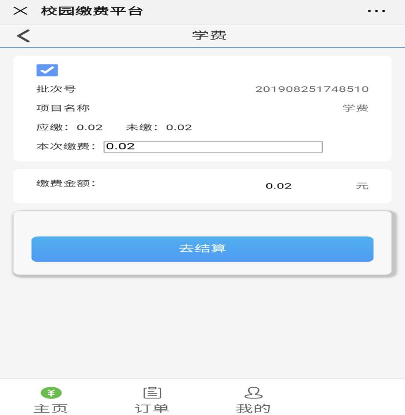 进入如下界面后,根据学费项目显示的应缴金额,来填写你实际要缴费的金额,然后点击“去结算”。最后点击确认支付,即可完成微信缴费。