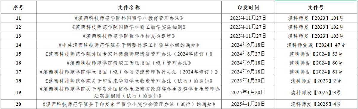 (一)落实留学生招收工作。做好留学生招生宣传工作,拓宽留学生招生渠道,与临沧市周边事务办公室联合招收12名留学生到校攻读本科学历,优化留学生招生结构。