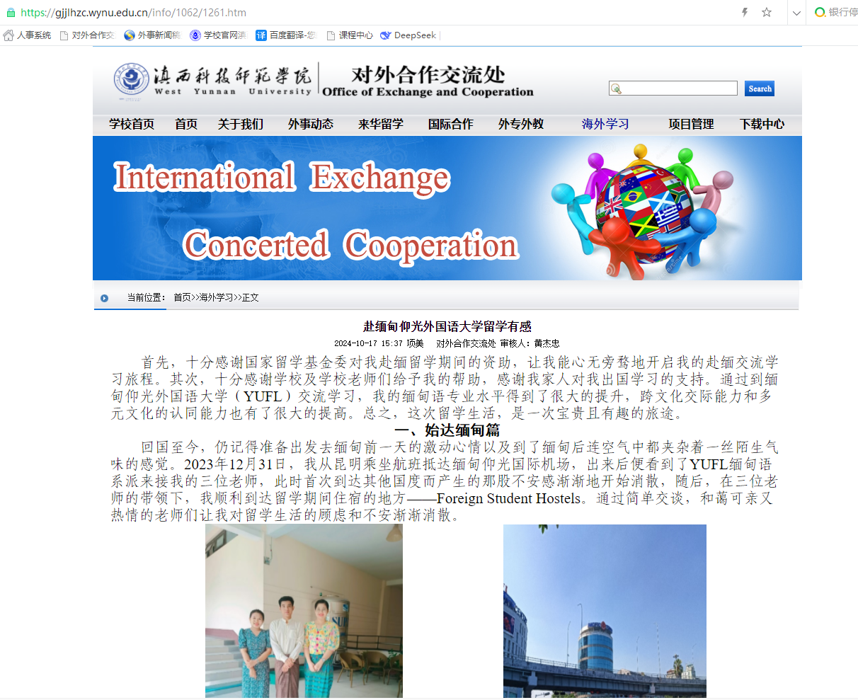 (四)推进学生出国(境)交流学习。与缅甸仰光外国语大学建立联系,选送5名学生赴国境(外)交流学习;并落实与韩国国立江原大学、泰国清莱皇家大学的教育合作备忘录,邀请棱镜教育咨询有限公司到校开展学历提升宣讲会,拓宽学生出国(境)交流学习渠道。